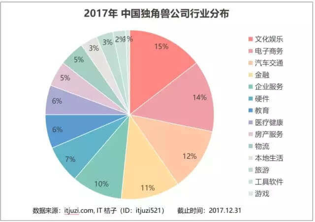 再接下来贡献独角兽第二多的是电子商务行业,有 17 家公司、占比 14%。这个领域的快速发展离不开消费升级、而且买卖商业模式清晰及现金流充裕,行业红利仍旧不错。这 17 家公司是近几年的电子商务新贵,包括美丽联合集团、美菜网、中商惠民网、拼多多、找钢网、齐家网、易果生鲜、贝贝网、小红书、转转等,分别从事女性时尚电商、食材 B2B 电商、社区电商、钢铁 B2B 电商、家装/建材 B2B 电商、生鲜电商、母婴电商、跨境电商、二手物品电商等。