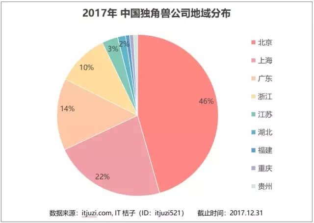 其中北京仍以 57 家公司、占比 46% 高居首位,相比 2016 年的 42% 比例有小幅上升;上海以 28 家公司、22% 占比位居第二位,相比 2016 年的 23% 略有下滑;广东以 18 家公司、占比 14% 位居第三位,相比 2016 年的 17% 有一定下降,主要是被北京获得;浙江以 13 家公司、10% 占比位居第四位,相比 2016 年的 11% 略有下降。可见,北京仍然是独角兽出没最多的地方,尤其是在文化娱乐领域捕获独角兽最多;而上海、浙江这两个区域在电子商务、金融领域捕获独角兽较多;广东的硬件和金融领域则产生独角兽更多。