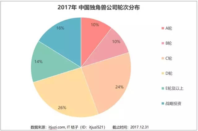 最新融资轮次:从独角兽公司的融资轮次来看,占比最高的是 D 轮(32 家公司、占比 26%),其次是 C 轮(30 家公司,占比 24%),相比 2016 年度占比最高的 B 轮,最重要的原因是不少 B 轮的公司均在 2017 年继续获得资本加注,有些公司甚至一年完成好几轮融资,在资本助推下高歌猛进到成熟期阶段(D 轮及以后)