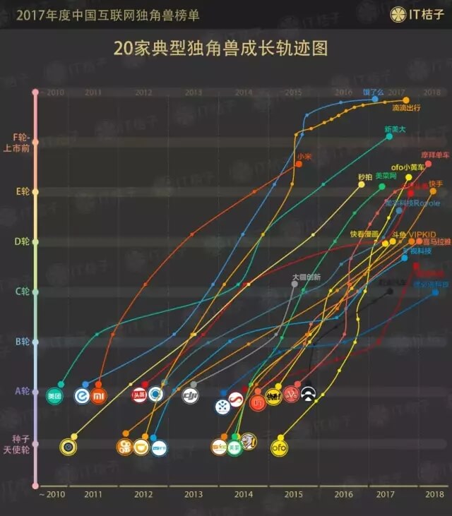 IT 桔子基于独角兽的估值区间,选取了 20 家非常典型的独角兽公司,将他们的融资时间作为横坐标、融资轮次及节奏作为纵坐标,每家公司的每一轮融资是“点”,然后“连点成线”,形成了如下 20 条曲线(折线),不知道你更喜欢哪类公司的成长轨迹?