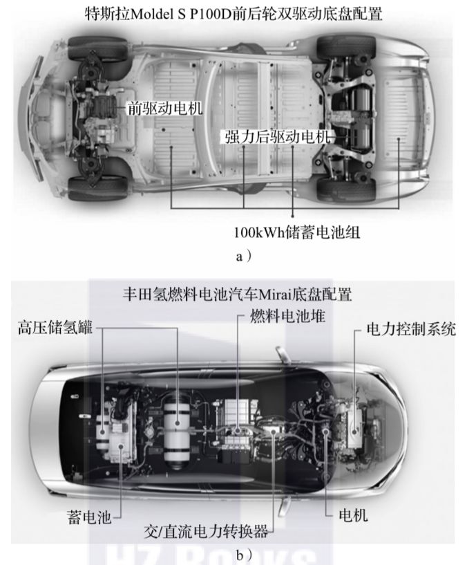 ▲图1-1 特斯拉Model S P100D底盘(a)和丰田Mirai底盘(b)