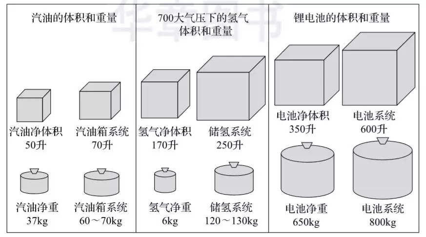 ▲图1-2 目前有500千米续航能力的ICEV、HFCV和BEV轿车动力源系统的体积与重量对比一览图,从能源使用效率上电动汽车显然比ICEV占优势,但HFCV车上的可利用空间比ICEV小