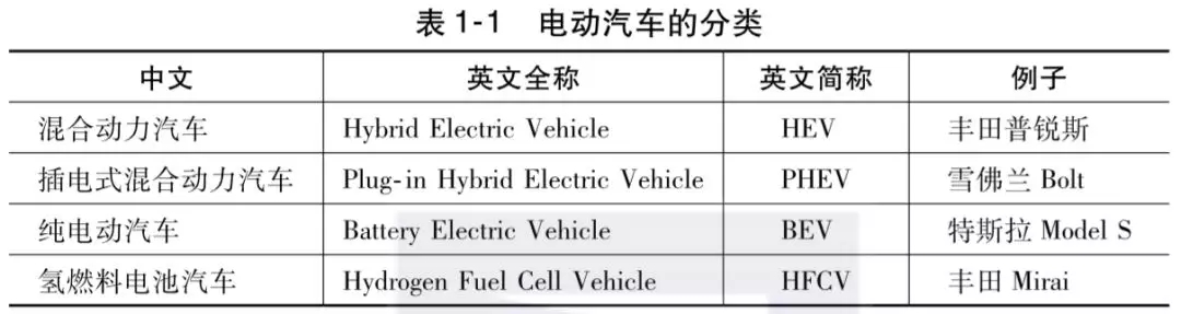 在本文的讨论中,除了以蓄电池为辅助动力源的混合动力汽车(HEV、PHEV)和以蓄电池为动力源的纯电动汽车(BEV)外,电动汽车还包括氢燃料电池汽车(HFCV),但是没有讨论在国内无须上牌的代步车,或者电动滑板这类代步工具。电动汽车包括的几种常见类型如表1-1所示。