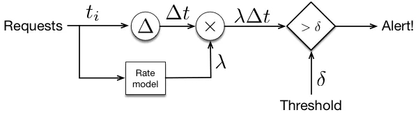 图 2. 请求速率异常检测器的架构。阈值用于确定速率何时低于预测值,因为事件之间的时间将上升到较高的水平。预测速率用于对这个时间进行归一化。