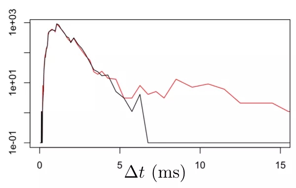 图 3. 以毫秒为单位的正常响应时间(黑线)与大约 1% 的响应明显延迟的响应时间的比较。得益于垂直轴上的对数刻度和不均匀的 bin 大小,可以清楚地看到 99%-ile 延迟的变化。
