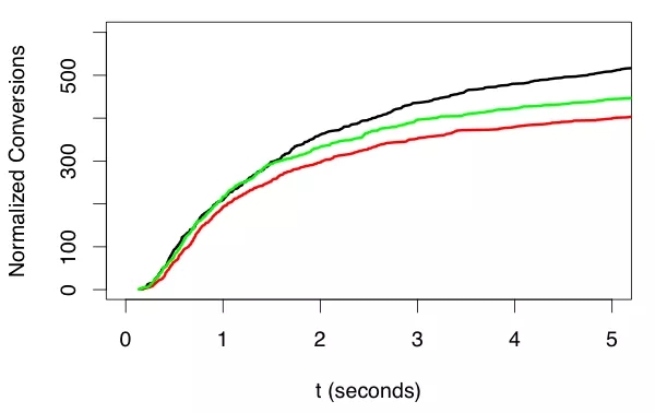 图 4. 转化需要根据原始曝光时间和曝光次数进行规范化。比较也必须在曝光足够长的时间以后进行,从而获得可靠的比较,但等待的时间过长也无济于事。在这里,绿色轨迹一开始看起来是最好的,但是在曝光 2 秒之后,只接收到 60% 的转化,很明显,黑色是最好的,红色是最差的。选择适当的延迟可以最快地对模型进行准确的评估。