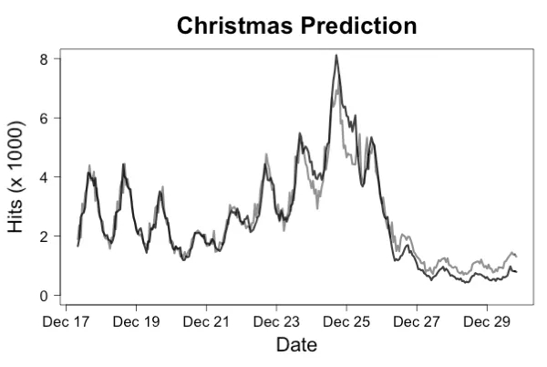 为了监控请求是否到达,你需要记录每个传入请求的到达,以及请求到达的机器的名称和准确的时间戳。最好是将这些数据记录到分布式平台上的持久流中,因为如果机器宕机,日志文件可能会消失。另外,最好将请求的到达和完成记录为单独的事件,这样就可以将响应失败与缺少请求区分开来。你可以构建的最简单的监控器是测量请求之间的时间。更进一步的话,是构建一个简单的预测器,根据最近的请求率预测当前的请求率,并使用预测的请求率乘以自上次请求以来的时间。即使是一个简单的线性模型,通常也会提前一个小时预测请求率,误差小于 10%,这使你可以在请求停止时发出警报。通过绘制维基百科“圣诞节”页面的预测流量,我们可以看到这种预测可以多么准确地工作,如图 1 所示。