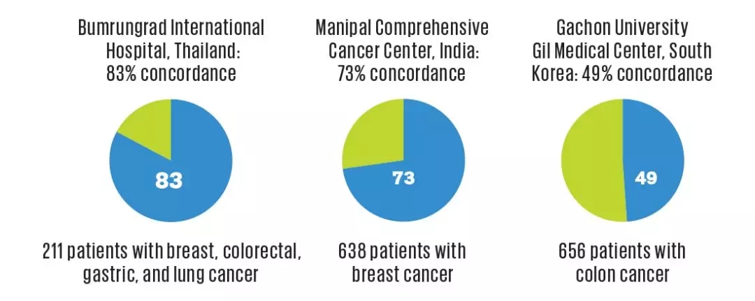 图 | 在泰国康民国际医院(Bumrungrad),在 211 例癌症评估中,Watson 与肿瘤专家的总体一致率为 83%;在印度,Manipal 综合癌症中心的 638 例乳腺癌病例评估中,Watson与肿瘤专家的治疗建议一致率为 73%,主要是由于转移性乳腺癌的表现不佳。在韩国嘉泉大学(Gachon University)Gil 医疗中心,Watson 表现更差,对 656 名结肠癌患者的建议与专家的一致率只有 49%。(来源: IEEE Spectrum)
