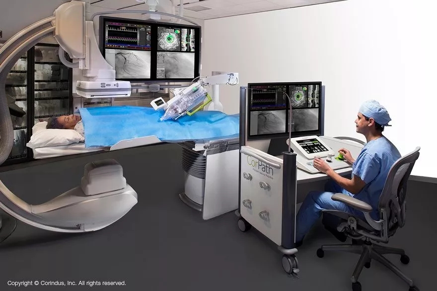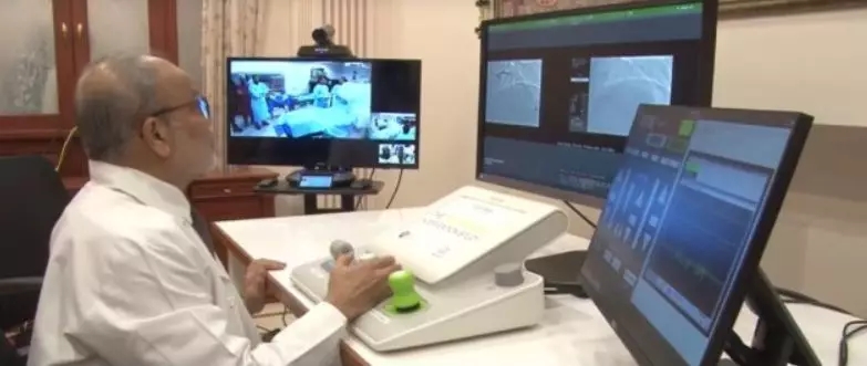 在远程手术过程中,Patel博士使用了Corindus公司的CorPath GRX机器人系统通过有线连接互联网,并用一组操纵杆和一台视频监视器操纵机器人。